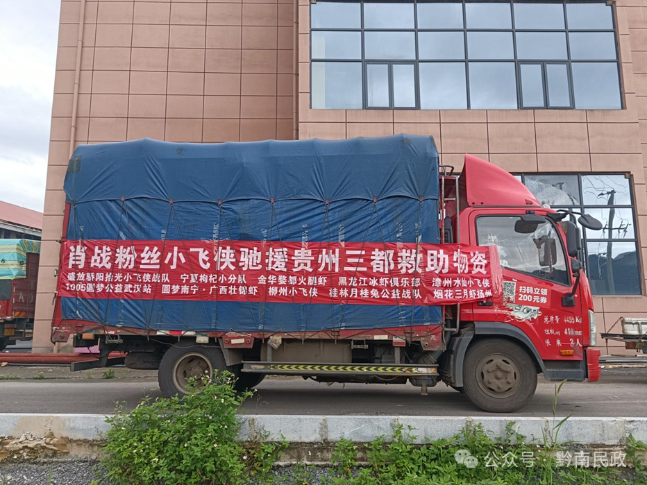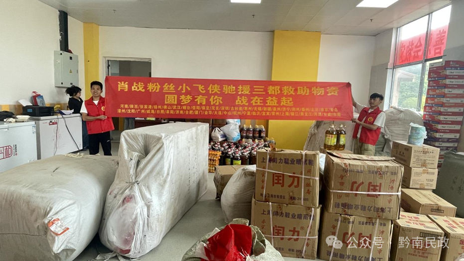 肖战先生的粉丝“小飞侠”持续响应救灾号召,紧急筹集爱心物资支援贵州三都灾区。6月30日,由漳州、成都、金华、黑龙江、武汉、宁夏、扬州、桂林、南宁、柳州等地小飞侠汇聚星光之力筹集的3车救灾物资日夜兼程运抵三都。7月2日,由河南、陕西、张家港、扬州、佛山、武汉、烟台、信阳、保定、茂名等地的小飞侠们又再次筹集物资捐赠三都。