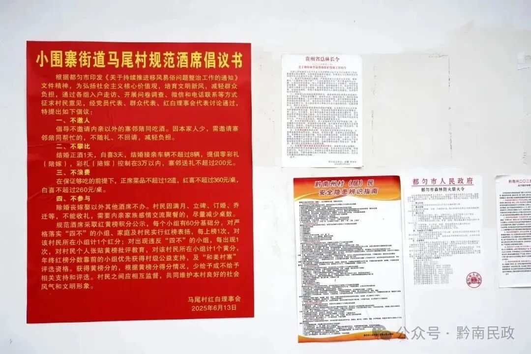 “倡导不邀请内亲以外的寨邻陪同吃酒。因本家人少,需邀请寨邻陪同帮忙的,不随礼、不回请,减轻负担。”“结婚正酒1天,白喜3天,结婚接亲车辆不超过8辆,提倡零彩礼(陪嫁),彩礼(陪嫁)控制在3万以内,寨邻送礼不超过200元。”“在保证够吃的前提下,正席菜品不超过12道,红喜不超过360元/桌,白喜不超过260元/桌。”“除婚丧嫁娶以外其他酒席不办。村民因满月、立碑、订婚、乔迁等,不能收礼,需要内亲家族感情交流聚餐的,尽量减少桌数。”走进马尾村的村头巷尾,随处可见张贴的《小围寨街道马尾村规范酒席倡议书》。