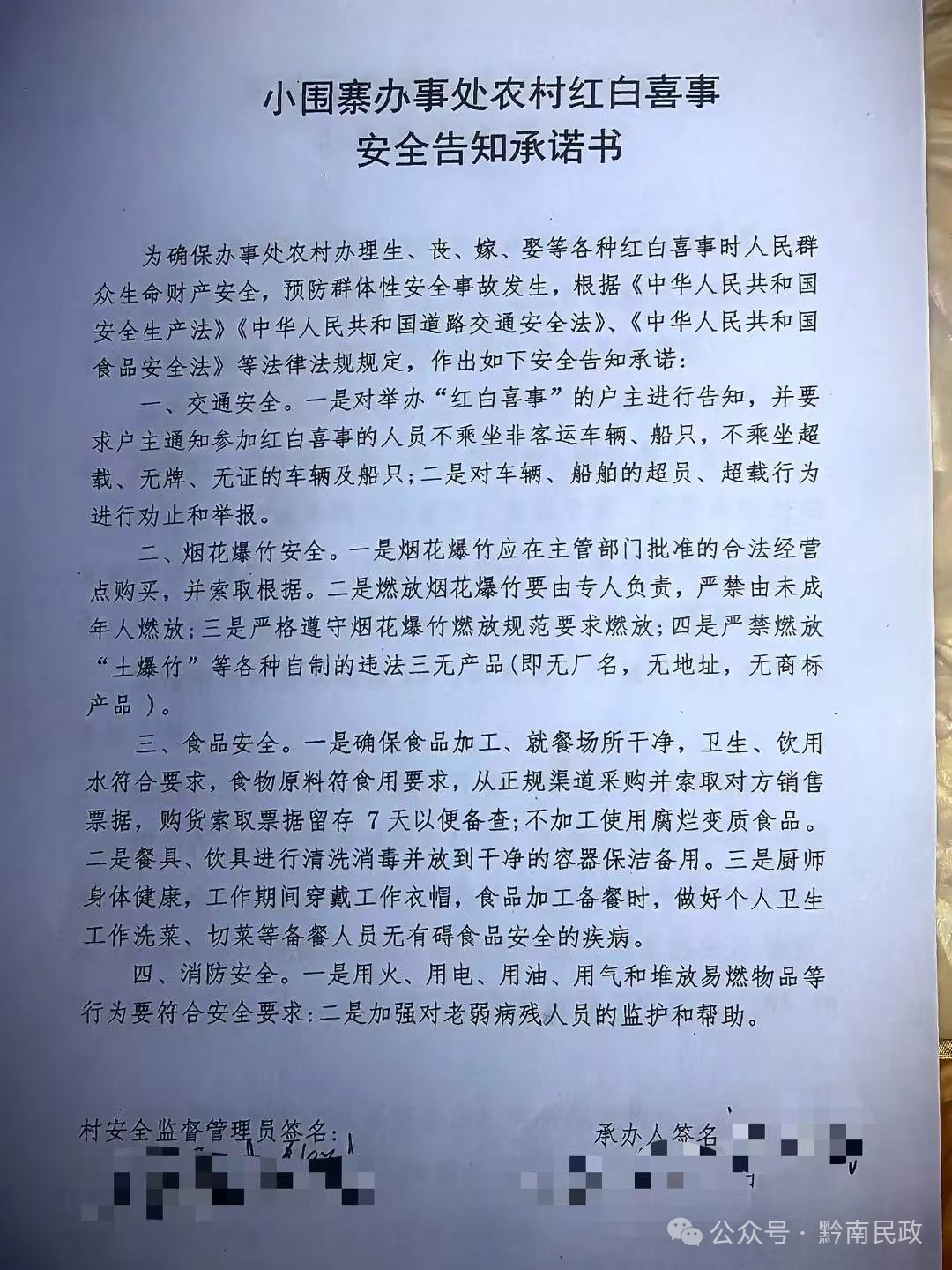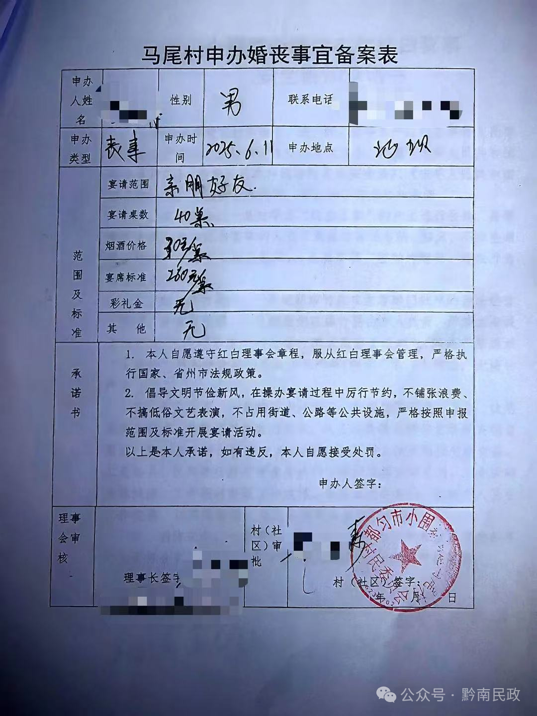 同时,需要办事的村民需要在办事前按照村里的红白事申报制度,由事主告知村里,并填写《马尾村申办婚丧事宜备案表》以及《小围寨办事处农村红白喜事安全告知承诺书》后,方可按规定操办。